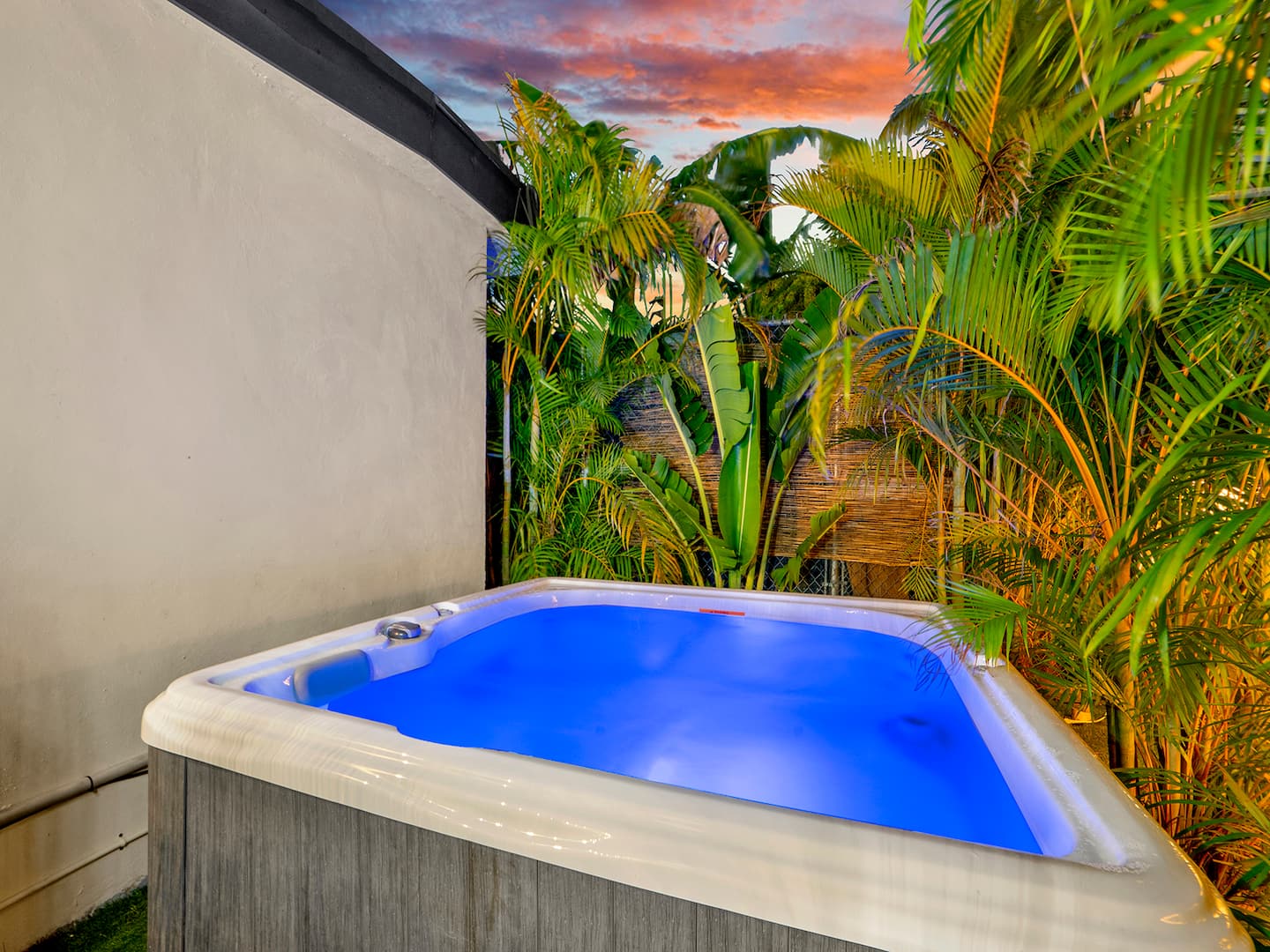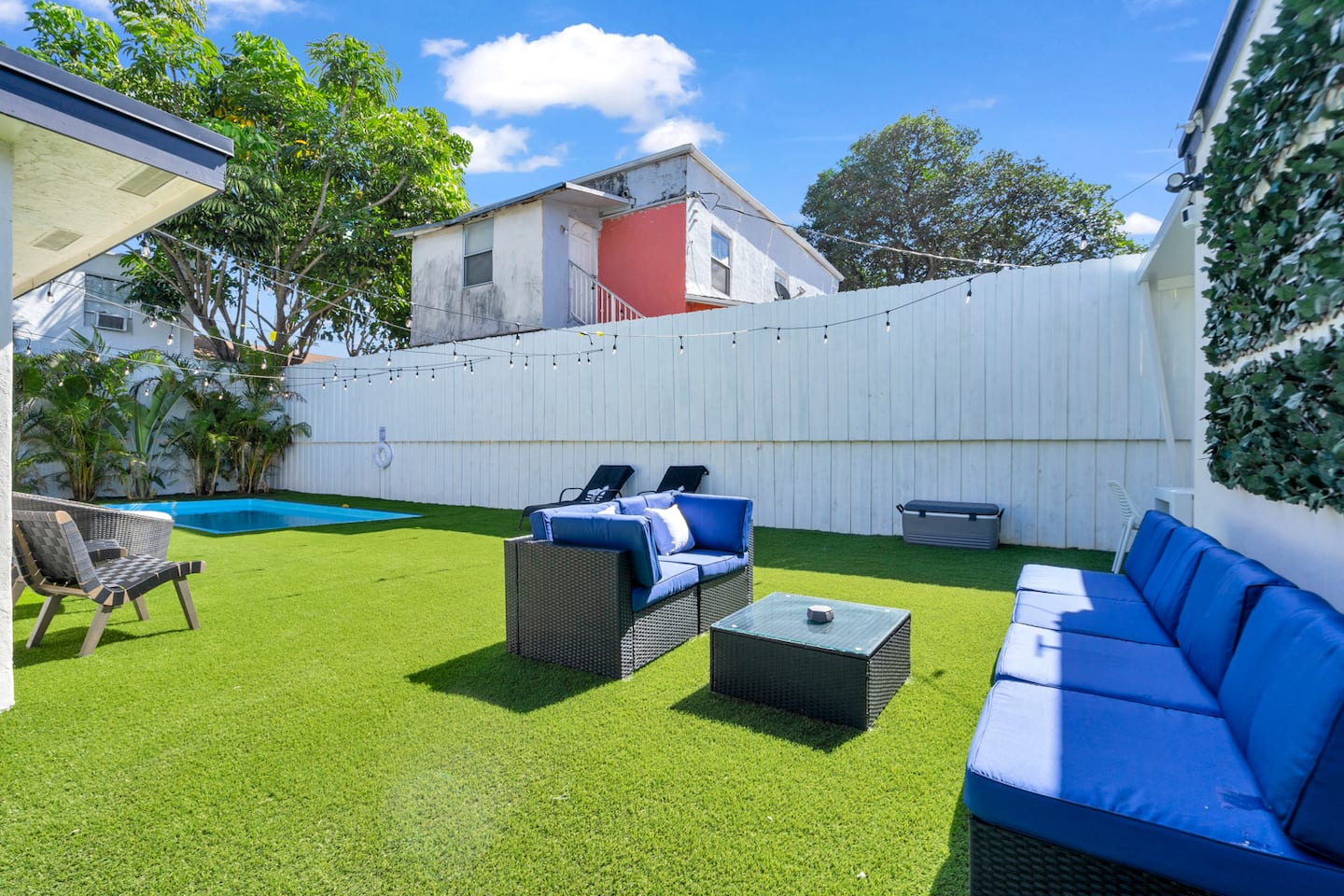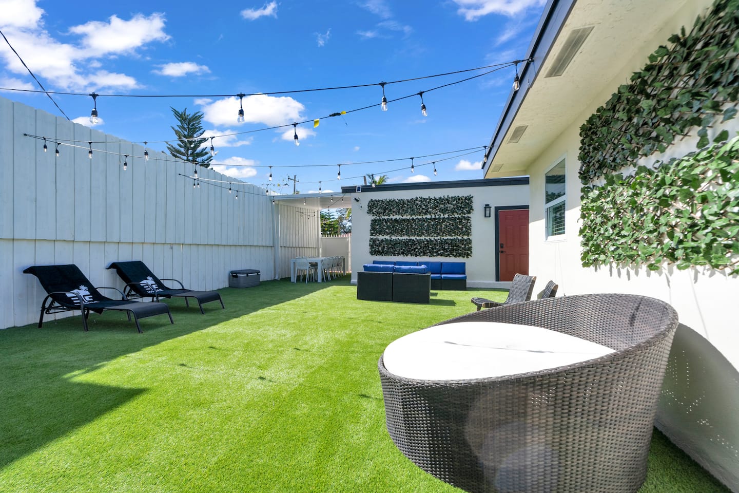 The backyard contains plenty of lounge space to soak up the sun. The entire space is artificially turfed. The pool and hot tub are awesome amenities that your group will love.