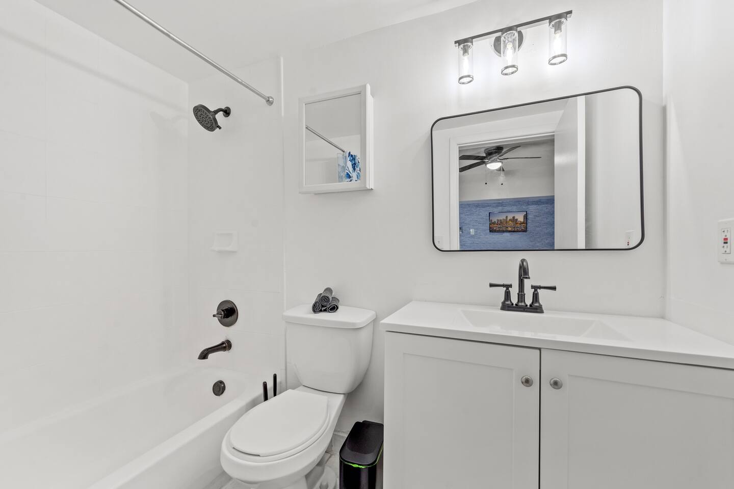 The en-suite bathroom is stocked with shampoo, soap, towels, and a hair dryer for your convenience. Additional amenities include keyless entry, an iron and ironing board, and ample storage space in the closets.