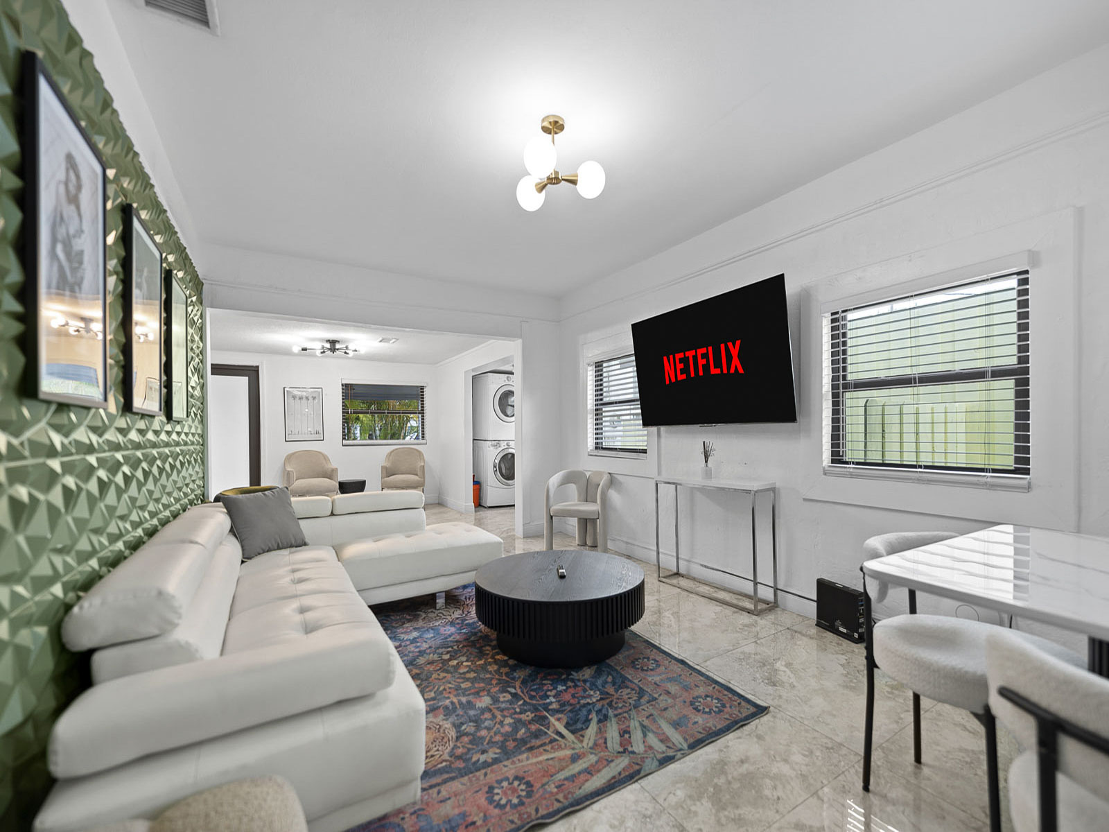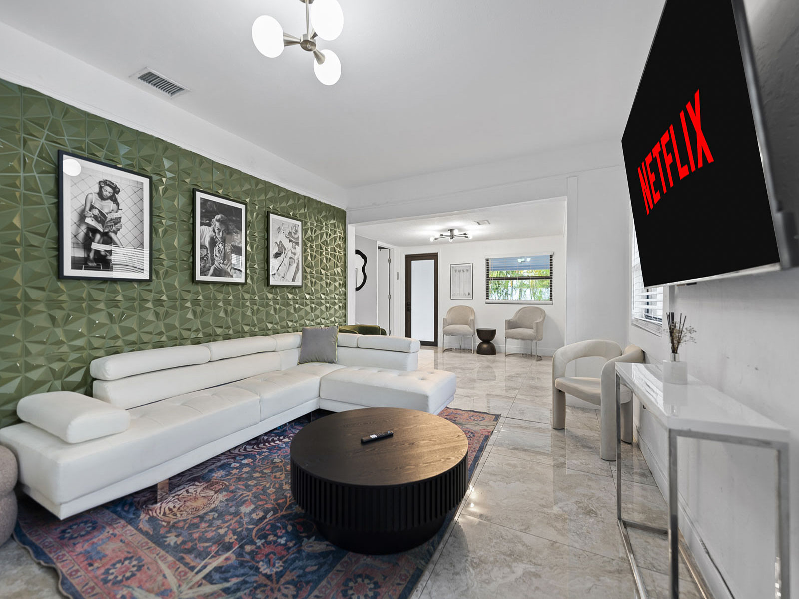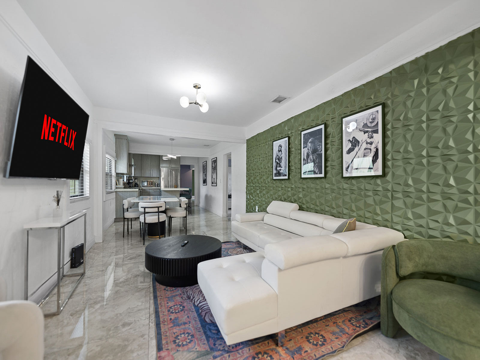 • Beautiful living room space with 60 inch Smart TV with YoutubeTV, Netflix, Hulu, Pandora and many other apps installed. Large living room for accommodating larger groups.