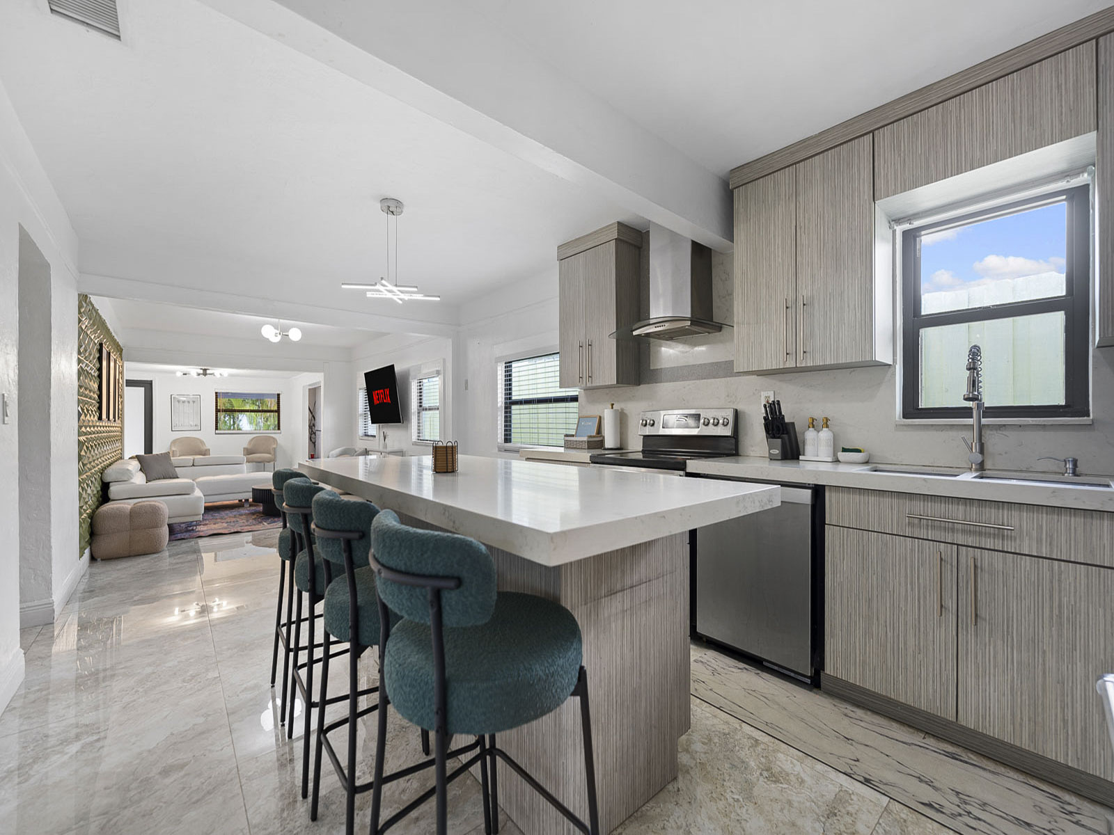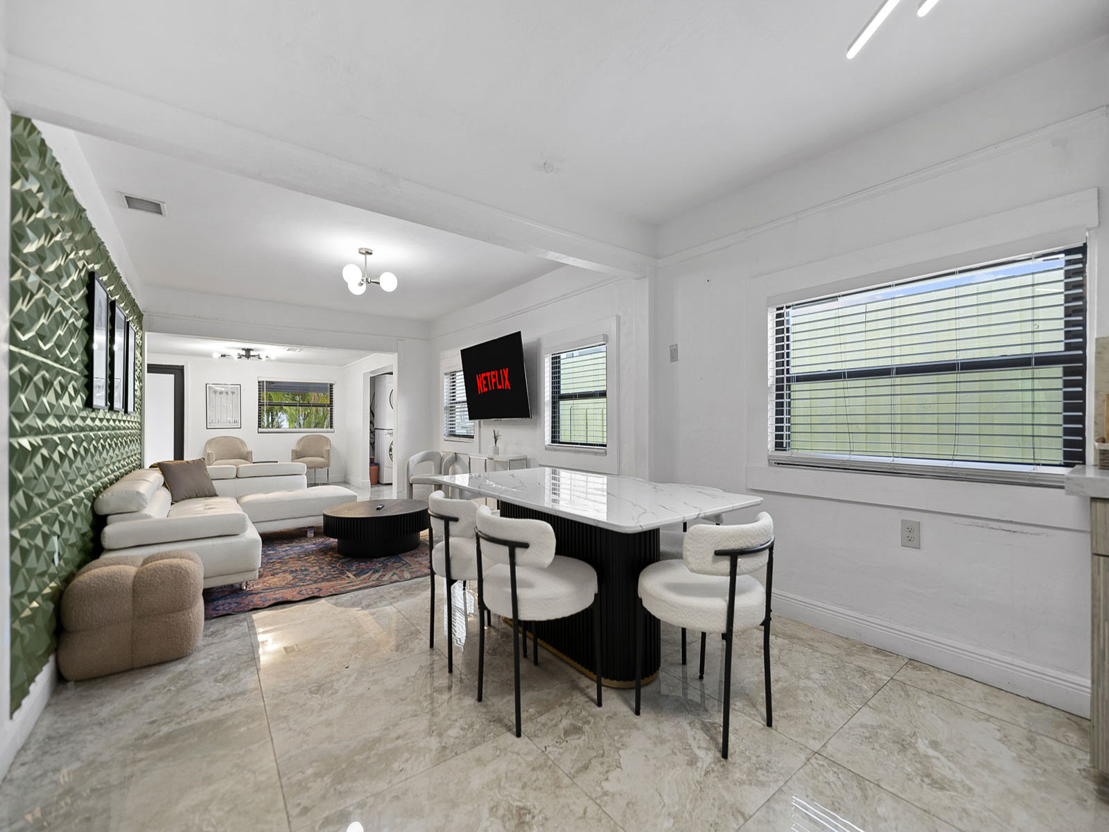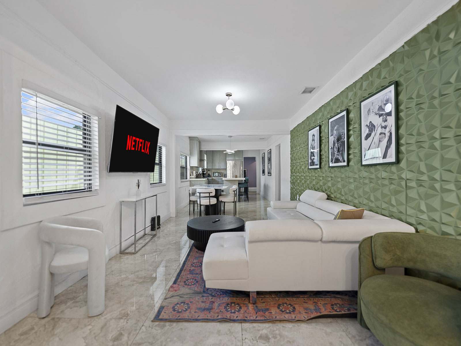 • Beautiful living room space with 60 inch Smart TV with YoutubeTV, Netflix, Hulu, Pandora and many other apps installed. Large living room for accommodating larger groups.