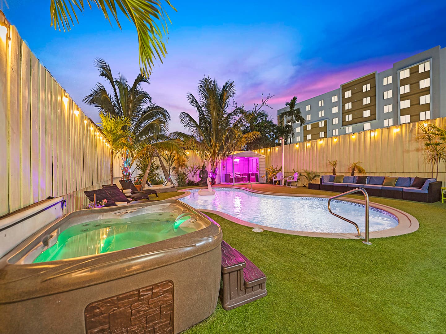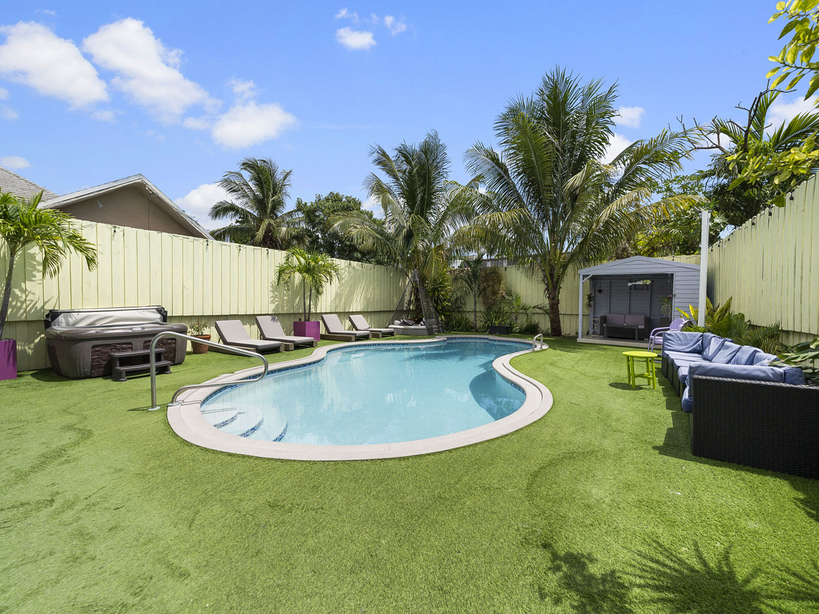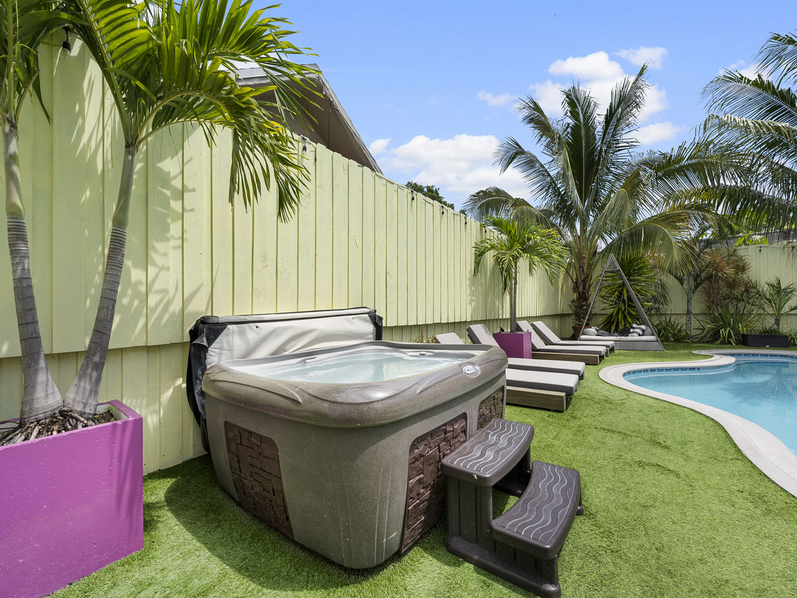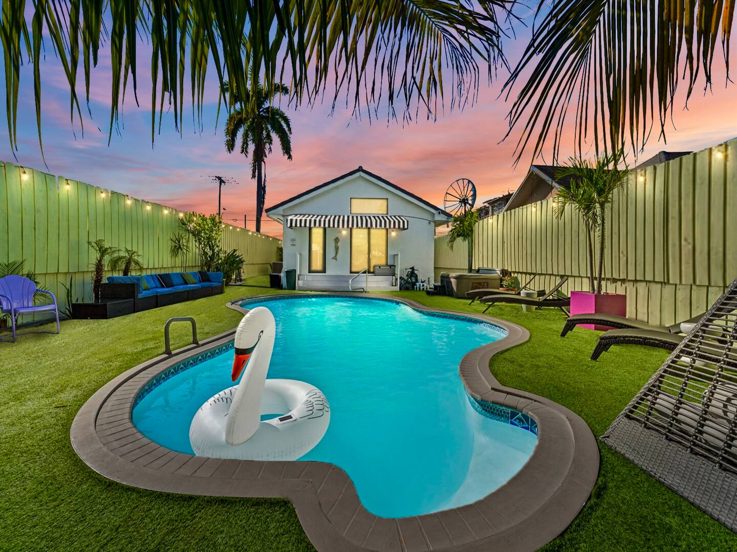 The backyard contains plenty of lounge space to soak up the sun. The entire space is artificially turfed. The pool and hot tub are awesome amenities that your group will love.