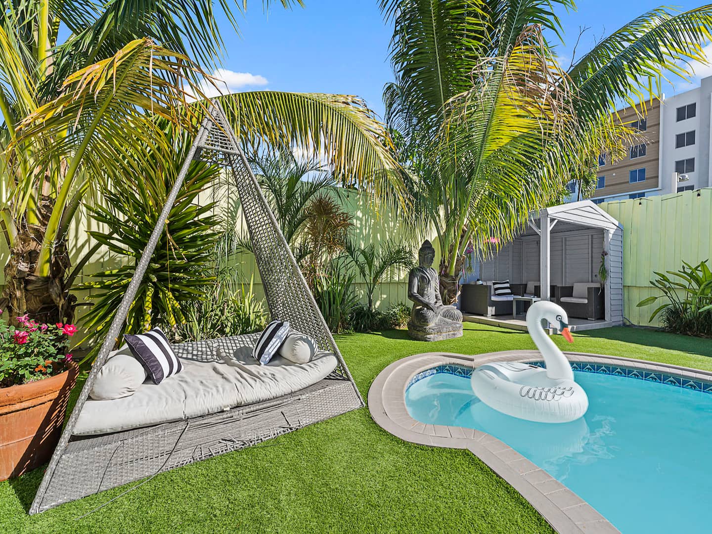 The house is located in a neighborhood that is quiet, but within walking distance of a small supermarket. The backyard was beautiful and felt like we were on Love Island. The rooms were spacious. Good cooking utensils. Just a note, Early/Late Check-In/Out are not guaranteed, so I would not plan on it.