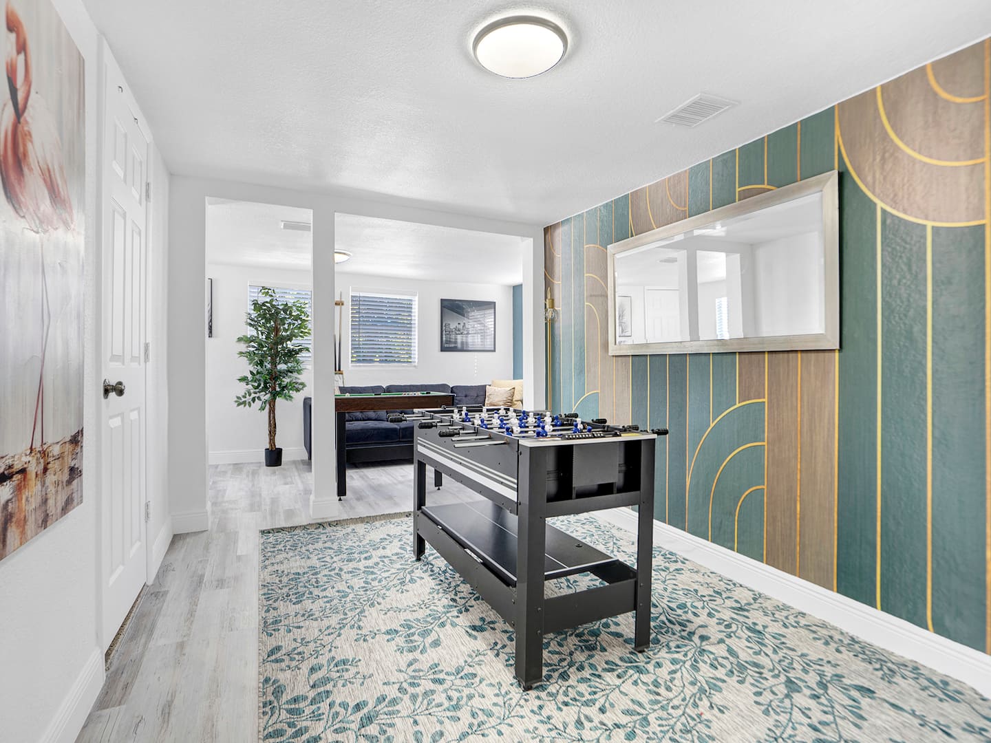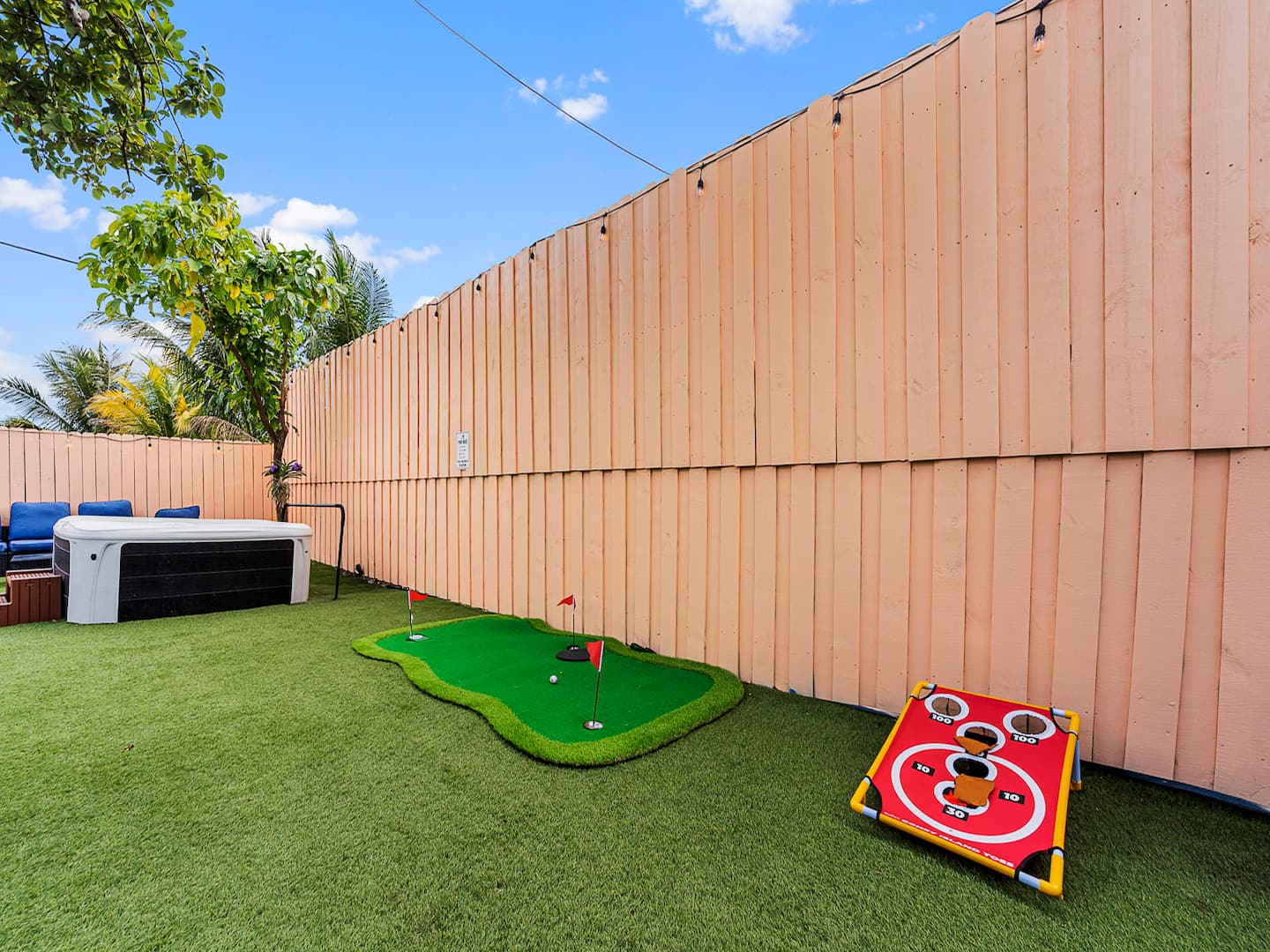 The backyard contains plenty of lounge space to soak up the sun. The entire space is artificially turfed. The pool and hot tub are awesome amenities that your group will love.