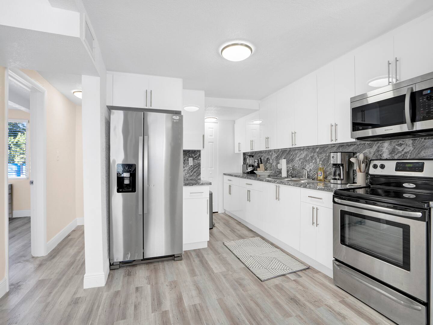 • Fully stocked kitchen with stainless steel appliances, washer/dryer, dishwasher, pots/pans, coffee maker, toaster and dishes, glasses and mugs.