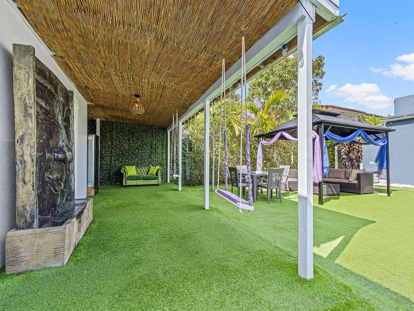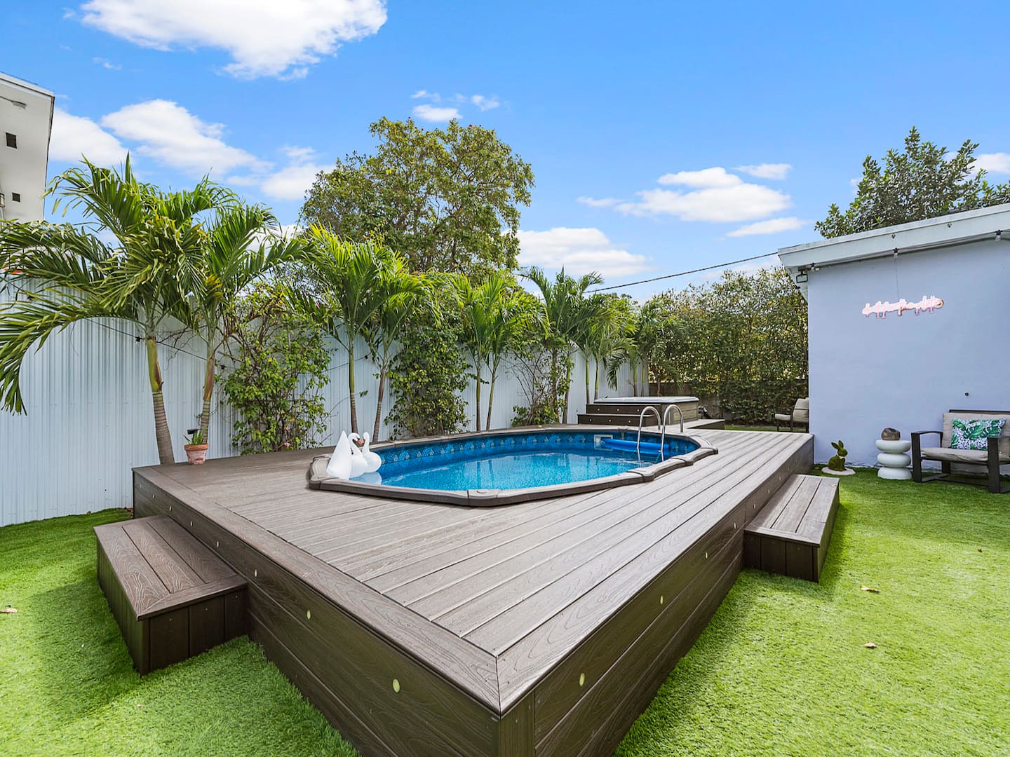 The courtyard in between the two units contains plenty of lounge space to soak up the sun. The entire space is artificially turfed. The pool and hot tub are surrounded by a deck giving guests the convenient luxury of cooling down in the pool or socializing with friends in the hot tub.